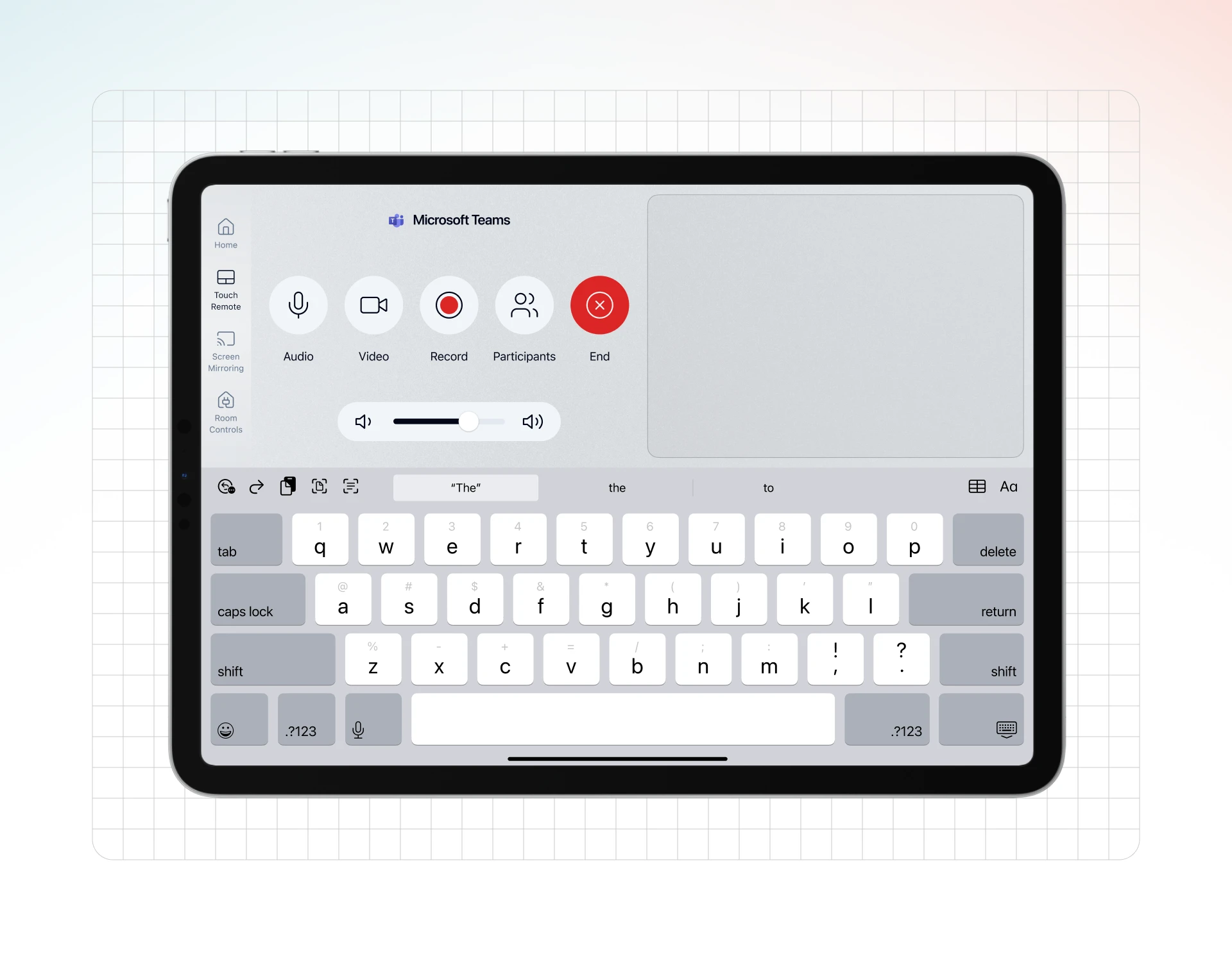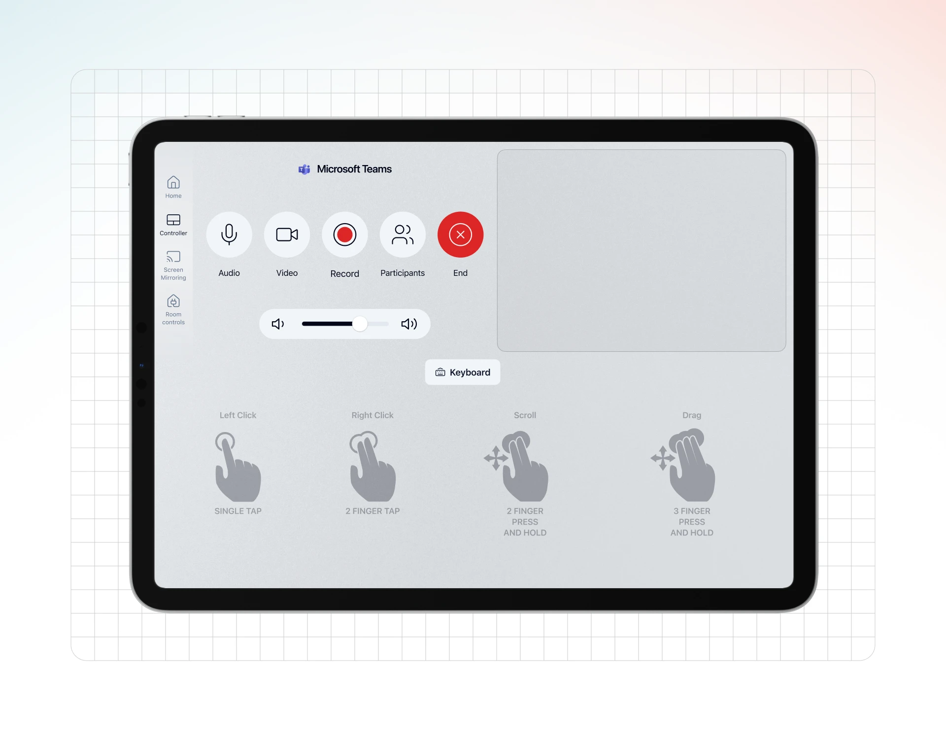 VCA 的 “触摸遥控” 功能不仅能让您使用 Controller 平板模拟物理鼠标和键盘来远程控制 Host 主机,当 Host 运行非 Rooms 版的视频会议软件时,此界面还会自动提供一个便捷的 “非官方会议控制器”,让您可以直接在 Controller 上进行常用的会议操作。