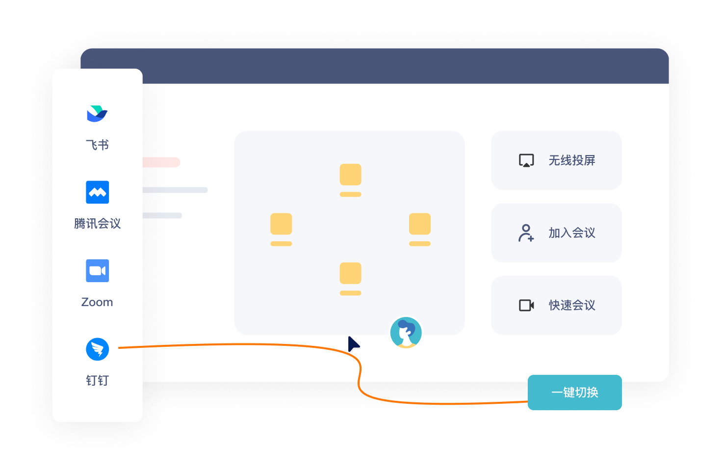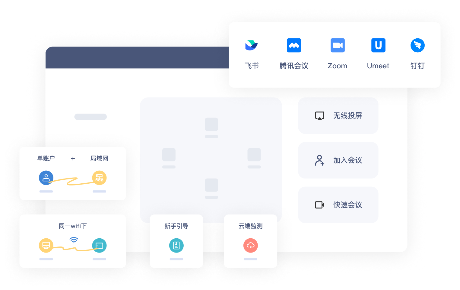 Quickly switch between Tencent Meeting Rooms, Lark Meeting Rooms, Zoom Rooms, Umeet Rooms and other video conferencing systems in the same conference room - convenient, fast, and efficient.